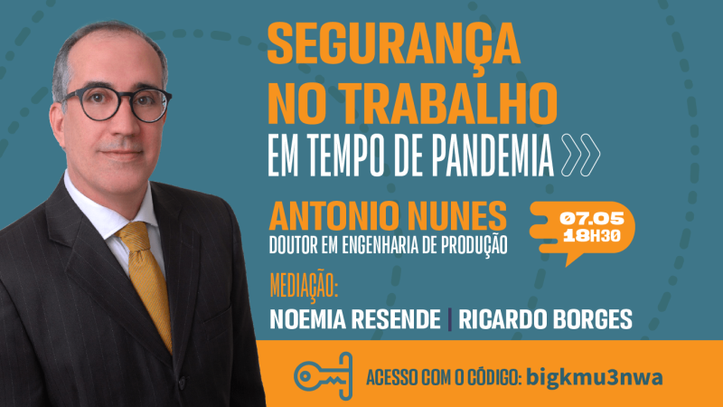 Open Talk: Segurança no trabalho em tempo de pandemia. No comando da palestra, Antônio Nunes, doutor em Engenharia de Produção e autor de diversos livros relacionados à área de segurança do trabalho. O encontro acontece dia 07 de maio, às 18h30, através do Google Meet, e será mediado por Ricardo Borges e Noemia Resende, coordenadores dos cursos de Direito e de Administração do UNIAESO, respectivamente.