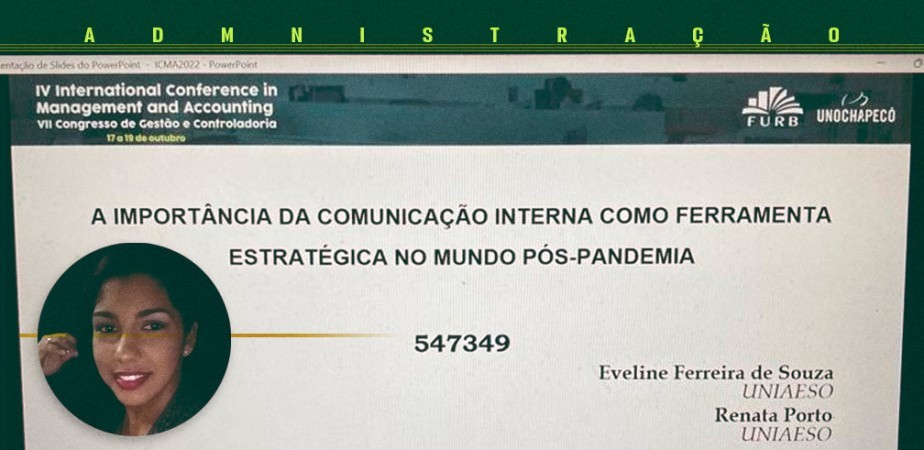 "A importância da comunicação interna como ferramenta estratégica no mundo pós-pandemia" é o título do artigo apresentado pela estudante de Administração da UNIAESO, Eveline Ferreira de Souza, no VII Congresso de Gestão e Controladoria da Universidade Regional de Blumenau ICMA/Cogecont2022. O evento aconteceu online.