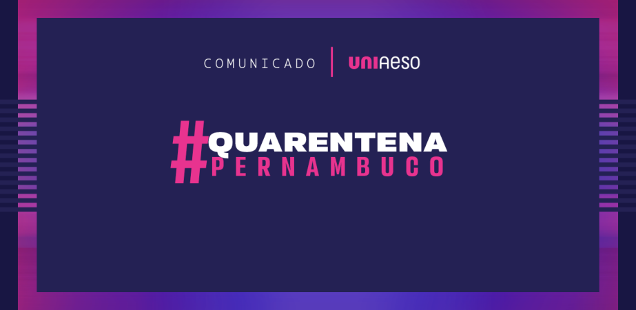 O Governo de Pernambuco adotou medidas mais rígidas a fim conter o avanço no número de casos da Covid-19. O decreto é válido durante o período de 18 a 28 de março de 2021. A UNIAESO segue também com a missão de preservar a saúde de todos. Portanto, o acesso presencial à instituição será restrito aos casos excepcionais e emergenciais, previamente agendados com o setor de interesse, para evitar qualquer tipo de aglomeração. As aulas seguem de forma remota. A gente agradece a compreensão de todos. Que prevaleçam o bom senso e o cuidado com o outro. A preservação da vida é o mais importante.