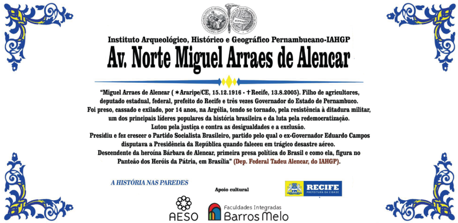 Instituto Arqueológico, Histórico e Geográfico Pernambucano (IAHGP), nesta segunda-feira (17), às 10h. A iniciativa tem como objetivo lembrar marcos da história do estado, posicionando painéis de azulejos para explicar ao público quem foram as pessoas que deram nome aos logradouros da capital pernambucana e outras cidades. As Faculdades Integradas Barros Melo - AESO são parceira do projeto.