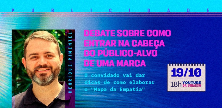 O curso de Publicidade e Propaganda da UNIAESO promove mais uma edição do TÁ ON. Na ocasião, o convidado Henrique Pimentel vai falar sobre como montar o Mapa da Empatia. É um recurso visual que utiliza um diagrama estabelecendo perguntas e tópicos sobre diferentes áreas da vida de uma persona. A partir dessa análise, as empresas e marcas podem conhecer mais a fundo os consumidores e direcionar as estratégias.