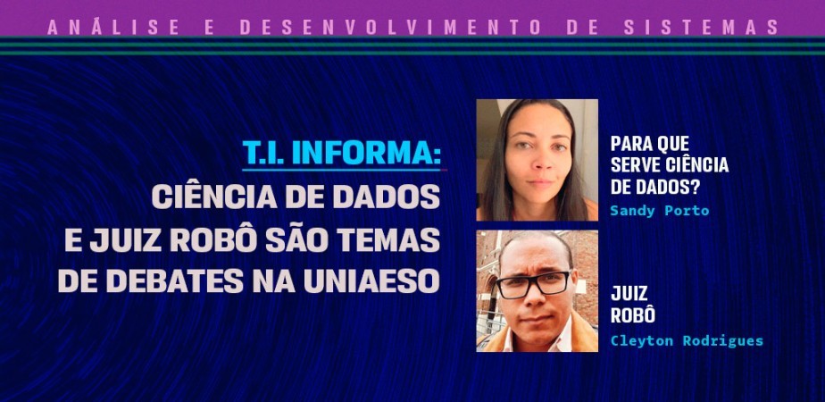 O curso de Análise e Desenvolvimento De Sistemas, do Centro Universitário UNIAESO, promove duas palestras , neste mês de outubro. A primeira acontece no dia 07/10 sobre ciência de dados, sob o comando de Sandy Porto, Doutora em Computação Aplicada. No segundo encontro, 20/10, o tema: "Juiz robô" está em discussão, com Cleyton Rodrigues, Engenheiro da Computação. Os debates acontecem no mesmo horário, às 17h30min.