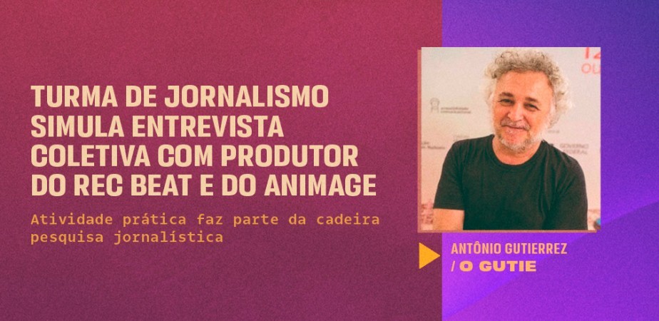 Os estudantes vão fazer um balanço do Animage, 11º Festival Internacional de Animação de Pernambuco, que aconteceu entre os dias 8 e 17 de outubro. Eles vão apurar as informações na coletiva simulada e, ao final, vão entregar uma matéria sobre o evento. “A ideia é praticar ao máximo aquilo que o mercado exige do novo profissional que está para entrar no circuito dos veículos de comunicação. Simular uma entrevista coletiva é só um desses exercícios. E quando é praticado com um profissional tarimbado e respeitado, no campo da cultura, como é Antônio Gutierrez (o Gutie) só aumenta a responsabilidade, e a riqueza fruto desse encontro", ressalta Luiz Joaquim, professor da disciplina.